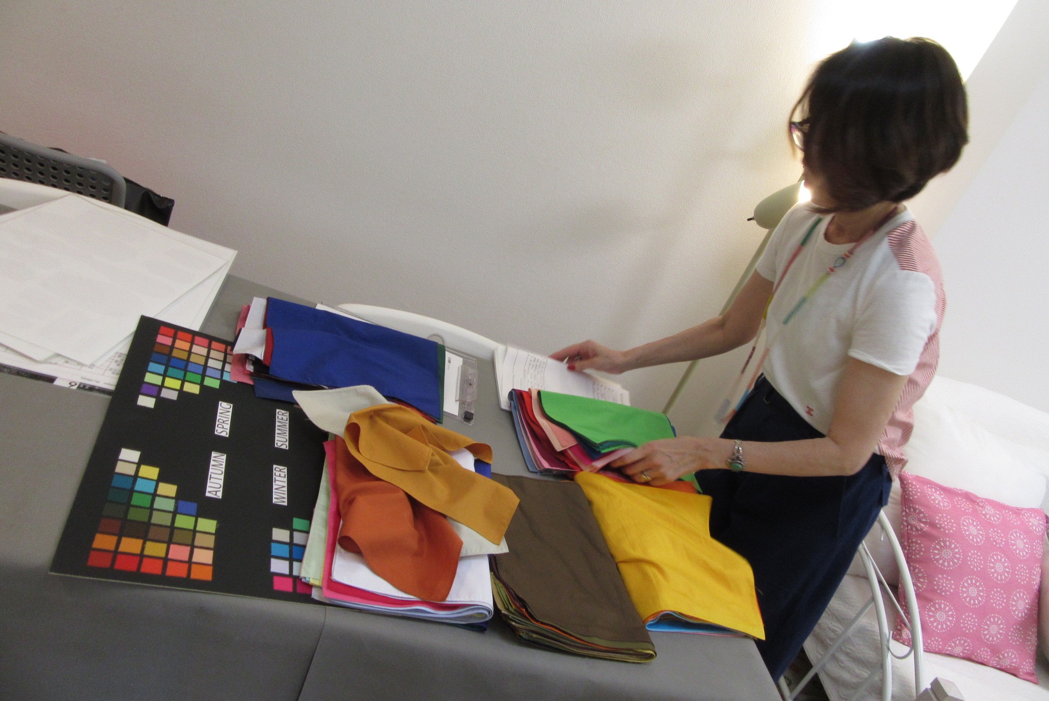 たくさんの種類の布を、実際に顔の近くに合わせてみて色写りを見ていきます。