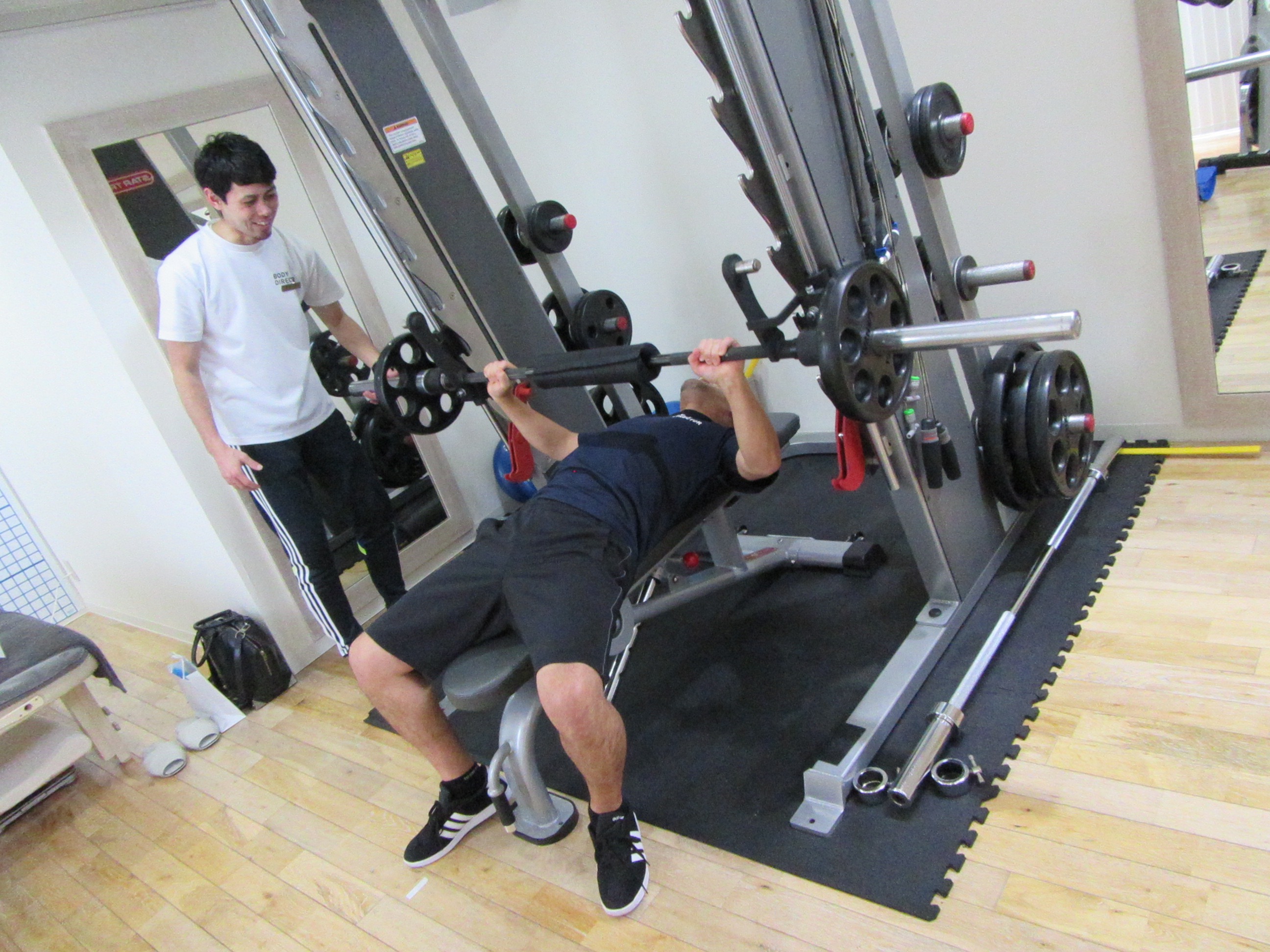 起き上がる時は、トレーナーに引っ張ってもらいます。