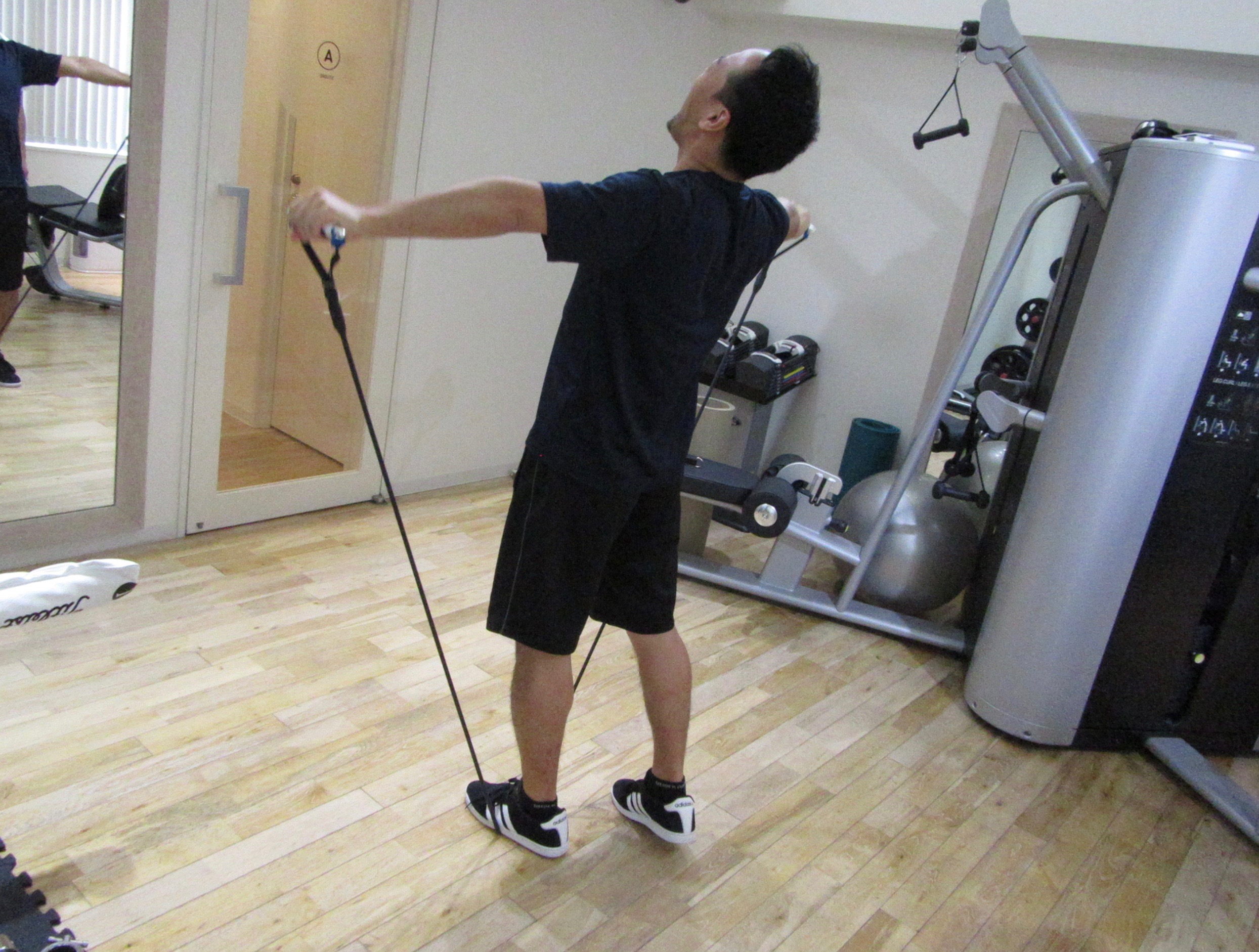ゴム製の縄跳びのような器具を伸ばして肩まで。