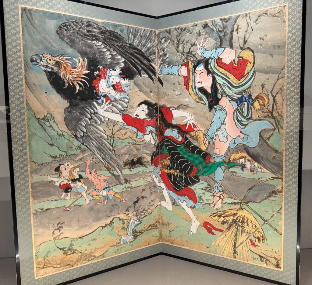 芝居絵屏風には物語が凝縮されて表現されています。物語そのものがドラマチックだということもあり、色彩も激しく感情豊かにすごい表情。血しぶきが飛び、おどろおどろしい場面が多いのですが、怖いはずなのになぜか魅力的で目が離せません。