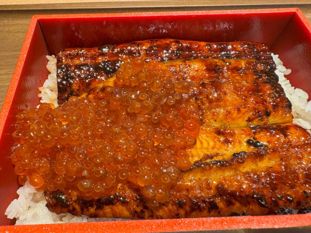 うなぎは、鹿児島か宮崎の国産。薪で燻され、薫香が漂います。ミシュランガイド1つ星店の寺田惠一料理長監修の赤ワインを隠し味に使った特製ダレで、お米は北海道のゆめぴりか220g。鰻にトッピングするいくらは、「銀座おのでら」仕込み。