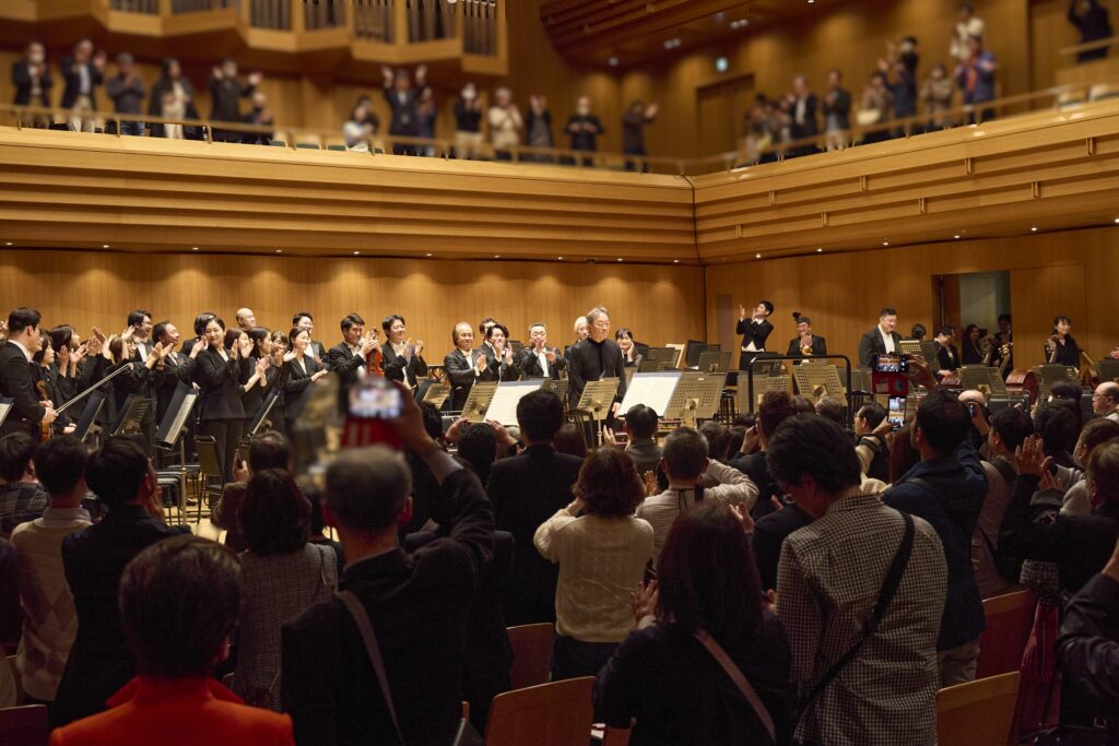 そして「巨人」の演奏が終わった後の、演奏家たちの清々しい笑顔がなんとも印象的でした。互いに握手し、ほめたたえあい、敬意に満ち溢れていました。最後は、チョンマエストロへの深い尊敬とあふれる愛情で、会場は総立ちとなり、いつまでも拍手が鳴りやまない感動の舞台となりました。