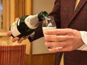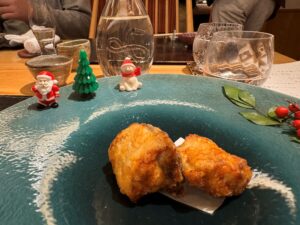 まず、乾杯は「吟天白龍2021」。パリで開催された、世界のTOPシェフを表彰する2024ガラディナーで乾杯酒として採用された酸味のあるスパークリングです。日本酒とは思えない味わいで、フレンチやイタリアン、スペイン料理にも、すんなり合いそうです。八戸酒造で作られた瓶内二次発酵ならではのきめ細かい泡が美しい。「河豚の唐揚げ」と合わせました。お皿に乗った、小さいサンタクロースや雪だるまがクリスマス気分を盛り上げます。