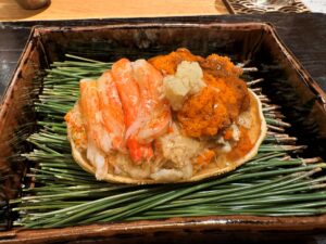 「香箱ガニあんかけ」は、甲羅にたっぷりつまった身が贅沢で、生姜の香りが広がります。合わせるのは、まろやかで日本酒らしいほんのりした甘みの千葉県・寒菊の純米大吟醸「Pray for」。中取り無濾過生原酒で、愛山という高価で珍しい酒米を使っています。