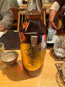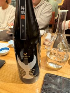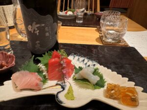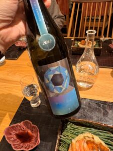 「お造り」は、はまち、本鮪、トラフグネギ巻き、河豚の煮凝り。河豚の煮凝りは味がついています。トラフグの葱巻きを食べると、最初に唐揚げも食べているだけに、河豚のフルコースを食べたような満足感があります。合わせるのは自然米の山田錦から作られた純米大吟醸「吟天花龍」。「華やかな香りを楽しむ酒」を目指して、杜氏が精魂込めで醸造しています。イタリア・ミラノで開催されている日本酒コンペティション2025で、味は金賞、ラベルのグッドデザイン賞も受賞し、2025年6月に発売して以来、すでに5つの賞を受賞しています。
