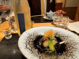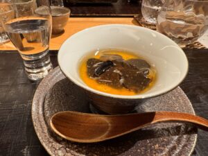 ここで、お店から特別に10周年のプレゼントとして「白子入りのトリュフの茶わん蒸し」が提供されました。黒トリュフのスライスがたっぷりのせられ、出汁の味が活きた茶碗蒸しで、白子が豊かな味わいを際立たせます。合わせるのは高知を代表する人気のお酒で「芳醇辛口」が特徴の酔鯨の純米大吟醸「象(sho)」。