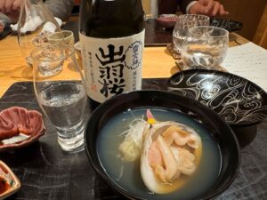 大ぶりの「ハマグリ椀」は、お出汁が秀逸です。合わせるのは出羽桜の純米大吟醸「雪女神」。「雪女神」というのは、大吟醸向けに山形県で30年以上かけて開発した酒米で、山形県でしか使えません。磨きは「三割五分」。このお料理に合わせて「吟天」のマイナス5度の冷蔵庫で2年間熟成させたものです。麗しい香りと、まろやかでふくよかな味が印象的です。