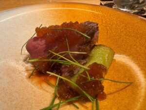 「鹿のロースト玉ねぎソース」は、しっかりした鹿肉にあまめの玉ねぎソースをかけてあります。岩手県の猟師さんから直接仕入れた鹿肉と、後ろに置かれた宮崎県の伝統野菜佐土原なす。合わせる「吟天龍王」は、米と麹と水だけでつくっていますが、琥珀色でこっくりした甘みがあり、お肉にピッタリです。酒蔵「龍力」の4代目本田眞一郎会長が日本酒の地位向上のために20数年前から貯蓄してきた貴重な熟成酒をアッサンブラージュして1年寝かせたものです。甘みと酸味のバランスが絶妙で、なんて美味しいんでしょう。極上の味わいです。「お料理に合わせるために、こういうのを作ってほしいとお願いしてつくっていただいています」と小田切さん。