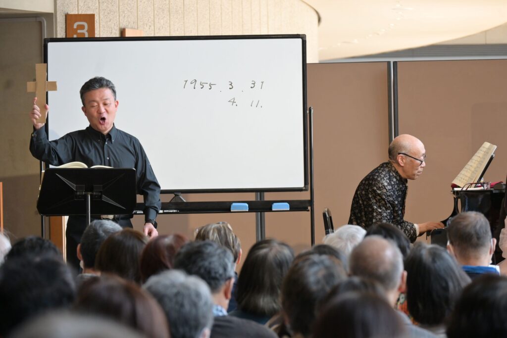島原の乱で天草四郎が亡くなった後、天草ではキリシタンが弾圧され、間もなく「踏み絵」が始まろうという時。百姓で障害のある「のろ作」の「おいはハライソに参れば」のアリアからレクチャーはスタートしました。歌うのは、新国立劇場に勤務する、名古屋音楽大学声楽学科出身の桑原さん。のろ作の邪心のない純真な心がハ長調の曲調から伝わってきます。