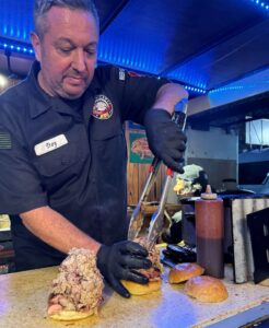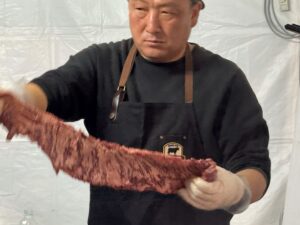 夕方になって、少し寒くなってきました。暗くて手元が見えなくなったので、私もDJに合わせて踊ったりしているとようやく順番です。約1時間で目の前で作ってくれます。まずはベーコン、そしてソーセージ、分厚いステーキのカット、そいだお肉を山盛り。すべてパフォーマンス付きで、後ろのアメリカ人と一緒に「イェーイ」と言いながら盛り上がります。最後のそいだお肉をのせるとき、これでもかというほど盛り付け、「マウント富士~」と言いながら押し付けます。上にバンズを乗せて串をさしてできあがり。「ちゃんと上を押さえないと崩れるよ」と、優しく教えてくれました。