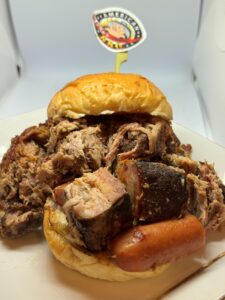 続いて、豪快なグリルが自慢の「Troys BBQ」。一番列が長かったのですが、写真を見ると一番おいしそうだった。どんなに時間がかかっても並ばずにはいられない魅力です。この店の一番人気は「Pulled pork sand」(1600円)だそうですが、せっかくならと、思い切って4種の豚、重さ500gの「The Porkinator MEGA BBQ」(3900円)を注文。食べきれるかしら。