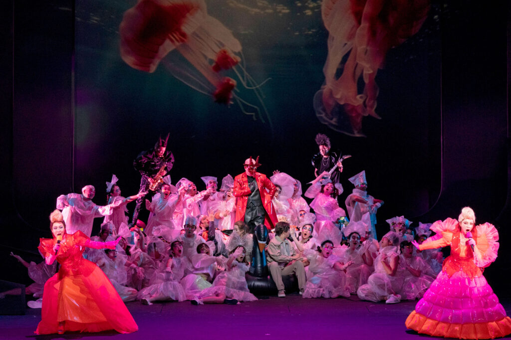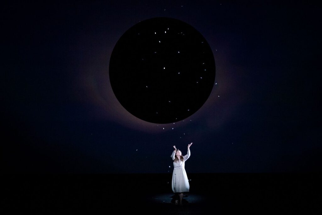荘厳な新国立劇場合唱団の歌声に、20以上のスピーカーが客席内にも配置され有馬純寿の電子音で環境音などを含む様々な音響が流れます。そして美術ダニエル・ウンガ―、映像クレメンス・ヴァルター、照明リック・フィッシャーといった世界トップクラスの才能が集結しました。