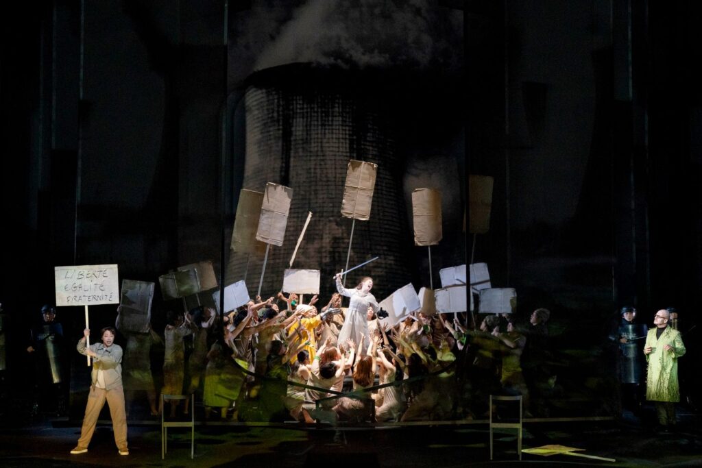 原発のような建物の前で騒いでいるのはデモ隊です。ここは「沼地獄」。すべてが焼き尽くされる「炎上地獄」で、ナターシャは美しいアリアを歌います。細川が「初めて自分のオペラで調整音楽を使った」というハ短調のアリア。これほど美しい音楽はあるのだろうかという曲です。「青い地球で唯一の化け物」と、人間のことを歌いあげます。今、アフリカで史上最大規模の旱魃がおきていますが最後は「旱魃(かんばつ)地獄」です。
