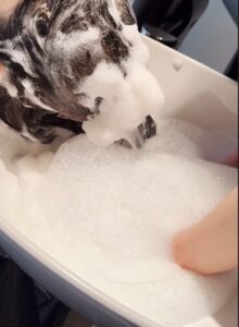 続いて、ReFaのシャンプーの中で上位ラインの、リファビューテックシャンプーを泡立てて洗い流します。きめ細かい泡が髪全体にいきわたったら、毛先まで全体をブラッシングすることで、汚れを浮き立たせます。洗い流して次はヘアドライ。