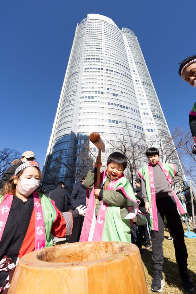 2006年からは地方自治体と一緒になって毎年異なる地域の米を育て、2025年は、山梨の米で水田に取り組みました。そして、1月10日は恒例の「もちつき大会」。今年で22回目です。参加者を募集したところ倍率は2倍。約200人の家族連れが集まりました。屋上庭園は高層ビルに囲まれていますが、空気が澄んでいて、はるか遠くに真っ白な富士山も望めました。足元では菜の花が栽培されています。会場には、山梨県の観光キャラクター武田ひし丸君も登場し、子供たちも大喜びです。