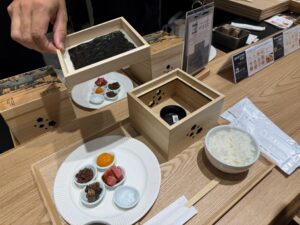 海苔を裏側にしてひし形に持ち、そこにご飯を少しのせ、好きな具材を入れる。最初は塩をパラパラご飯の上にふっただけで食べてみます。パリッパリの海苔が口に入ると海苔の香りと旨味、するっと溶ける口どけなどがよくわかります。山本社長に「まずは、海苔を味わってください」と教えていただき、この食べ方をすると海苔本来の香りが感じられます。具材は、1種類でもよし、何種類か合わせてよし、好みの食べ方で。私は、普段あまりご飯は食べないのですが、お茶碗に一膳ぺろりといただきました。海苔の美味しいのは、本当に美味しいです。