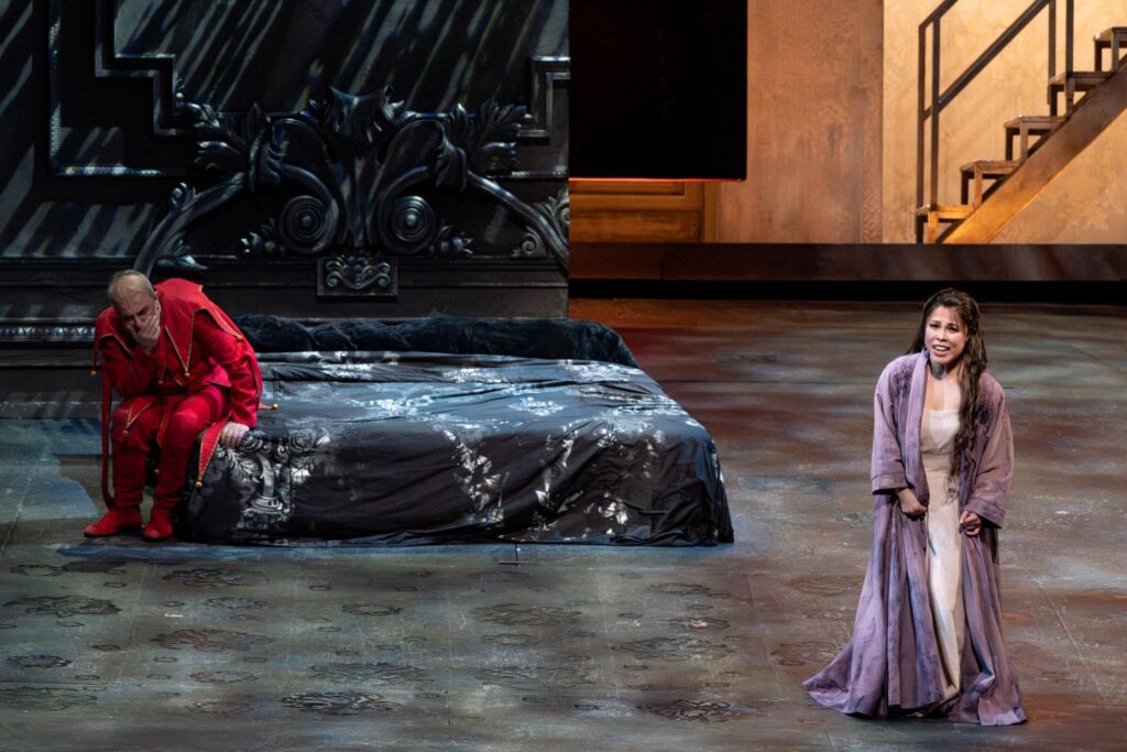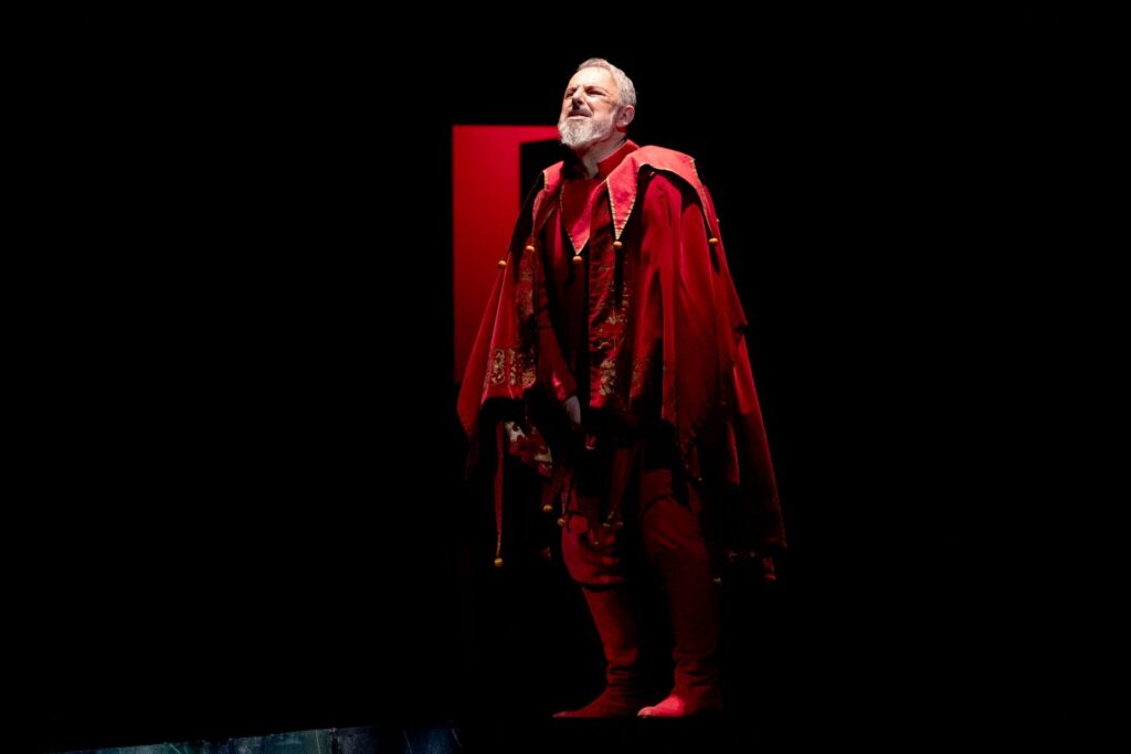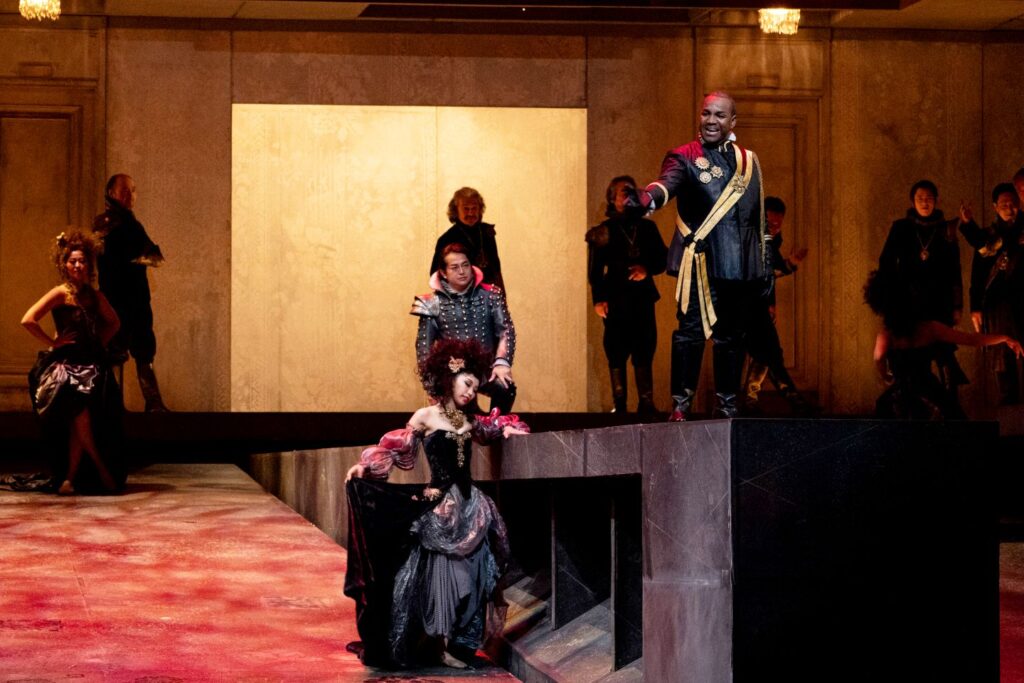 演出は、エミリオ・サージ。2022/23シーズンに新制作したものの再演です。これほど強烈な舞台美術だったかしらと、目を疑いました。幕が上がると、赤と黒の色調の舞台に、荒涼とした砂漠のような所に屍が累々と転がっているように見えます。なんとも寒々しい雰囲気です。それが一転、あかりがつくと公爵家の宴の席に変わります。
