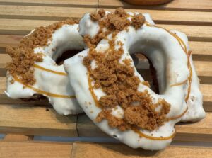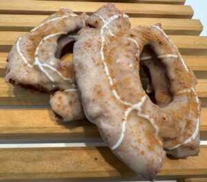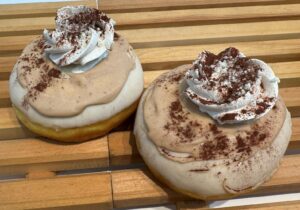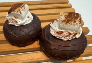 1月28日から登場すしたのが新作4品。ラテをテーマにしたドーナツです。濃厚キャラメル風味の「バタースコッチラテファッション」(275円)はカラメルクランブルのクランチが乗っています。チャイ風味の「チャイティーラテファッション」(275円)はシナモンの香りが漂います。「マシュマロココアラテ生マラサダ」(429円)には、炙ったマシュマロとホイップクリームが飾られています。今回の私の一押しは、「ホワイトモカ生マラサダ」(385円)やキリマンジャロとコロンビアをブレンドしたエキス、バニラシロップを混ぜたチョコやホイップクリーム、ホイップの上にココアパウダーとホワイトチョコクランチがのせてあります。コーヒーチョコもかかっています。