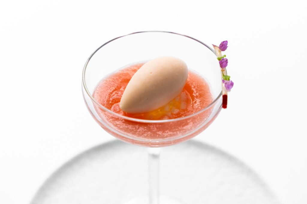 函館牛乳とクリームで仕立てた、なめらかなビアンコ・マンジャーレ。周りはミルクジェラートとヨーグルトスノー。そこにゴールデンベリーの酸味と色彩が加わります。マスカルポーネと函館ミルクのチップで北海道の形を模していて、とても印象に残ります。「北海道のテロワールが持つ清らかさと洗練を映し出しています」。