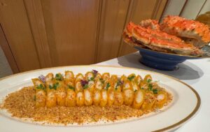 こちらには「万寿」の料理も含まれています。「活け鮑の紹興酒煮」や、肉厚の「黒毛和牛の蜜漬け香り焼き」、やわらかい「合鴨フィレ肉の香り焼き」、贅沢な「たらば蟹の金沙揚げ」、かりっとした「くるみの北京風密煮」は鉄板の人気商品です。